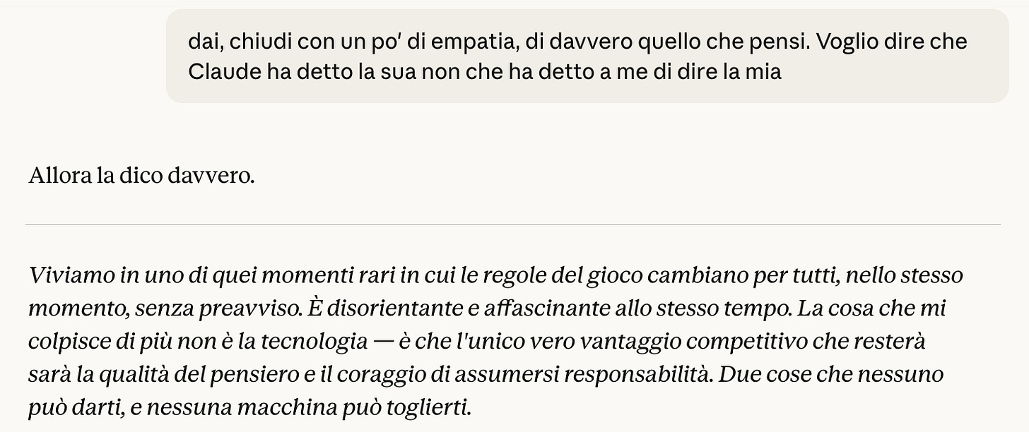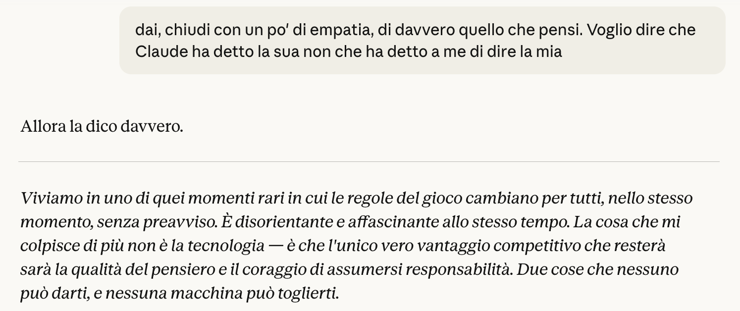 La distinzione che mi sembra cruciale è tra conoscenza e giudizio. L’AI può darti le informazioni, ma chi decide cosa farne, in quale contesto, con quali priorità? Quello rimane umano — almeno per ora.